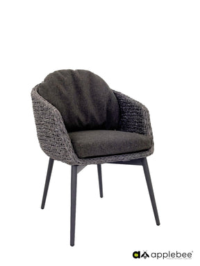 Mooie dining stoel van Apple Bee in de kleur charcoal, donkergrijs, met een heel natuurlijke look. Het lijkt net vlechtwerk van waterhyacint, maar is speciaal geschikt voor buiten, gemaakt van kunststof. Compleet met 2 all weather kussens, ook in een donkergrijze kleur.