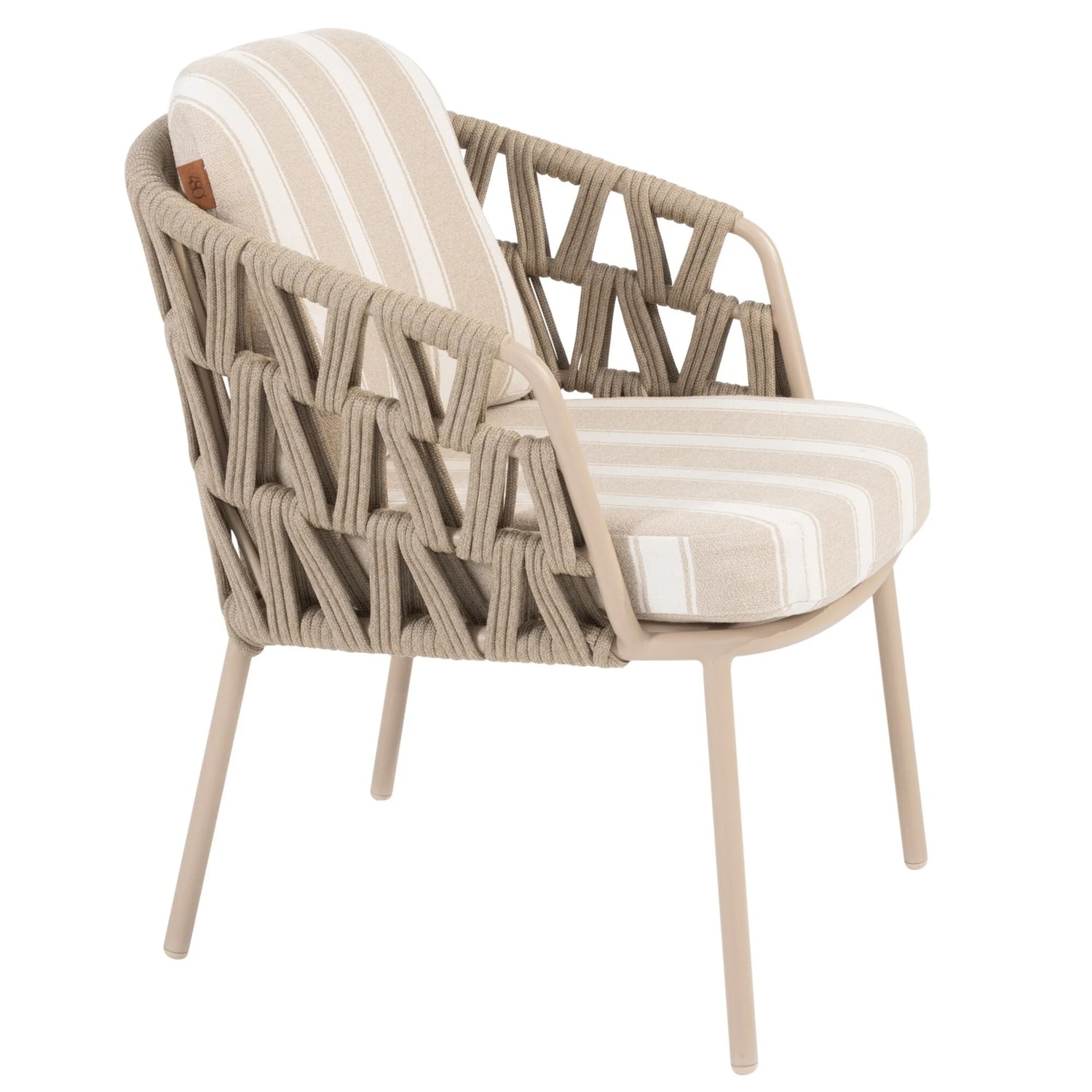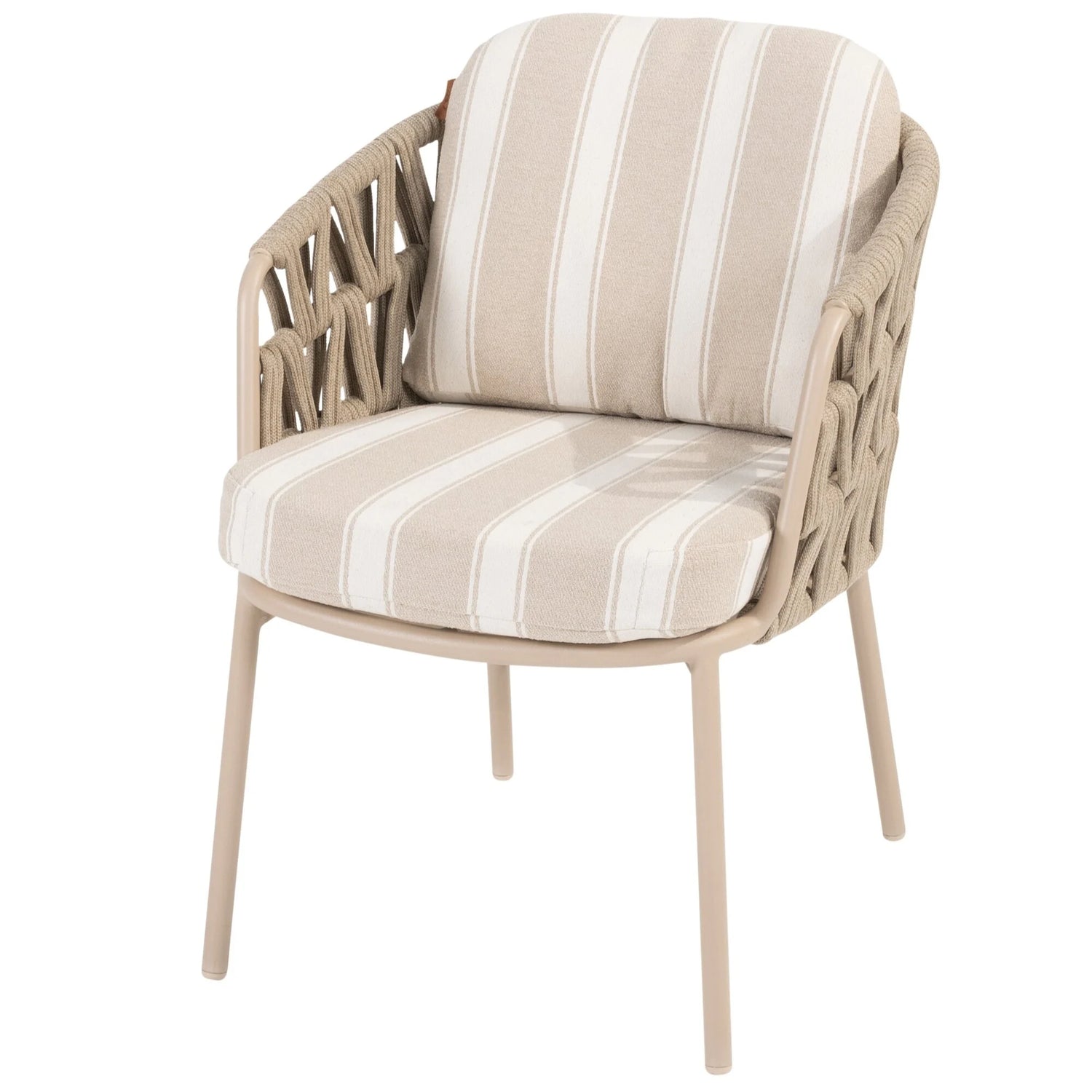 Elegant ontwerp: Aluminium frame in de warme kleur Latte, gecombineerd met subtiel rope-vlechtwerk – een stijlvolle mix van modern en natuurlijk design.