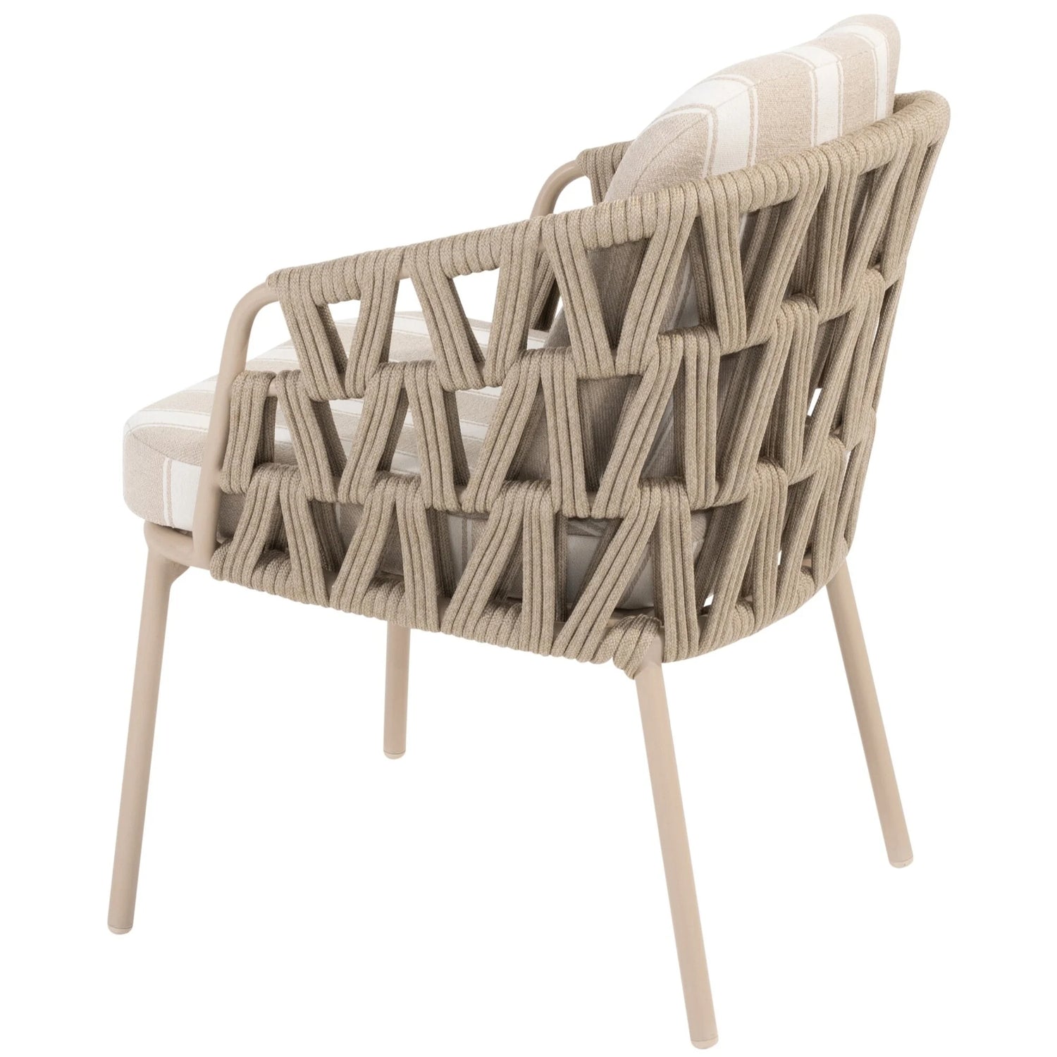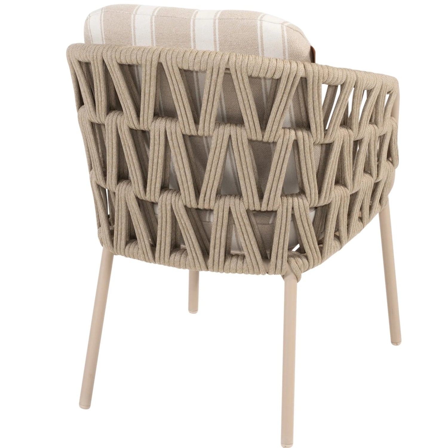 Weerbestendige materialen: Gepoedercoat aluminium frame, handgevlochten rope en Olefin-kussens die bestand zijn tegen zon, regen en temperatuurschommelingen.