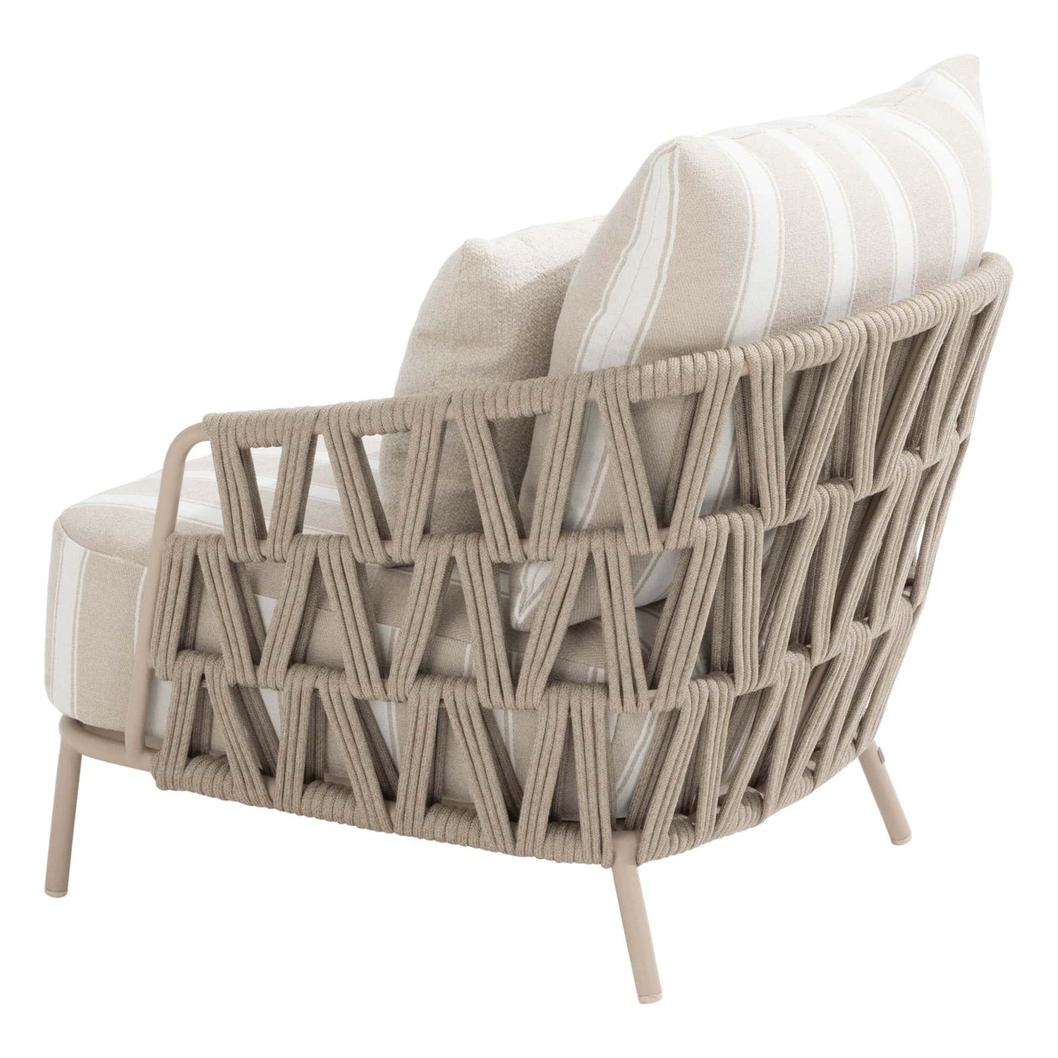 Weerbestendige materialen: Gepoedercoat aluminium frame, handgevlochten rope en Olefin-kussenhoezen, bestand tegen zon, regen en temperatuurschommelingen.