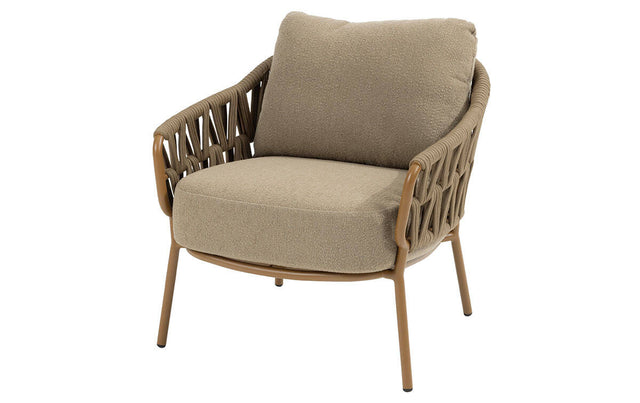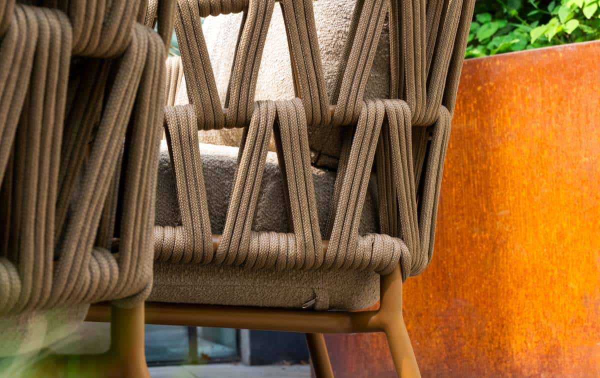 Luxe rope-design: De warme amberkleur en het open weave rope geven de stoel een elegante, loungeachtige uitstraling.