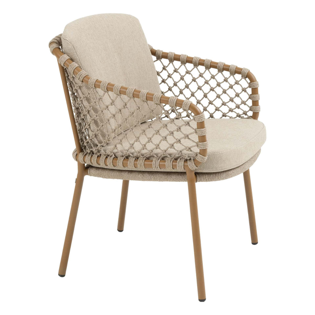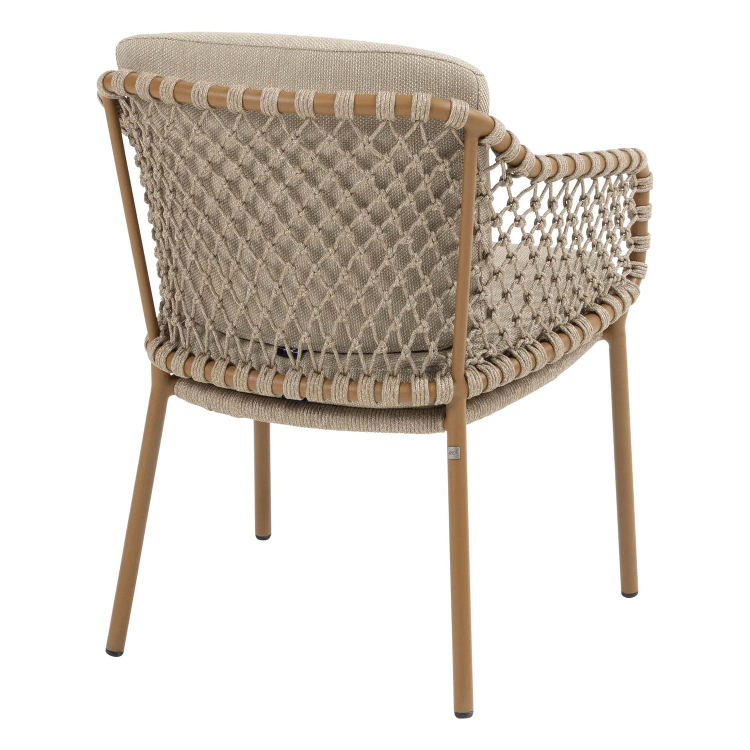 De Martinique dining stoel combineert een elegant modern design met hoog zitcomfort en verfijnde afwerking. Het gepoedercoate aluminium frame in warme Amber-kleur vormt een stijlvolle basis, terwijl het handgeweven rope en de twee all-weather kussens zorgen voor optimale ondersteuning en ontspanning tijdens lange diners in de buitenlucht.