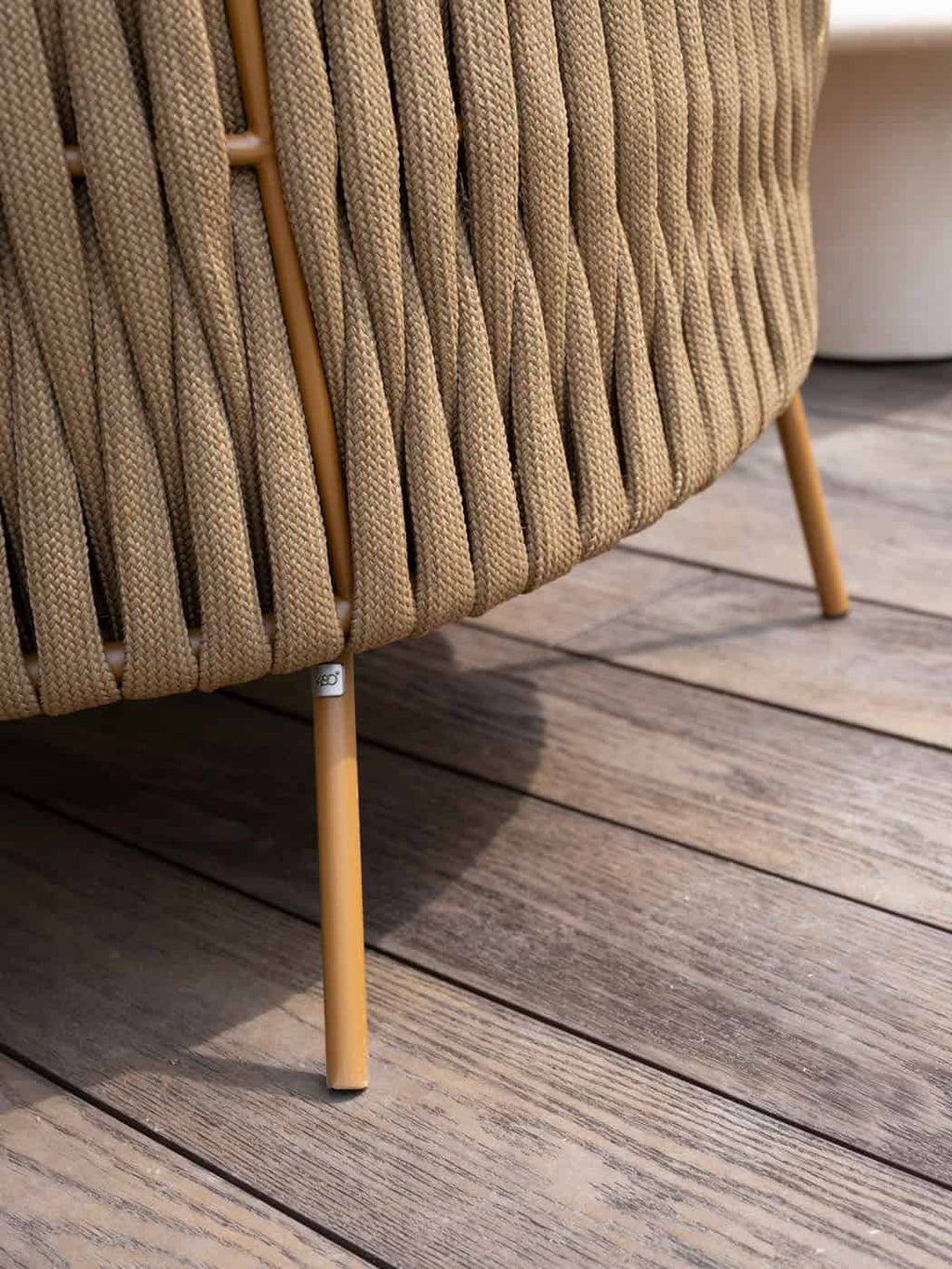 Elegant ontwerp: Warm amberkleurig frame gecombineerd met dik, handgevlochten rope in bruine tinten, modern, stijlvol en uitnodigend.