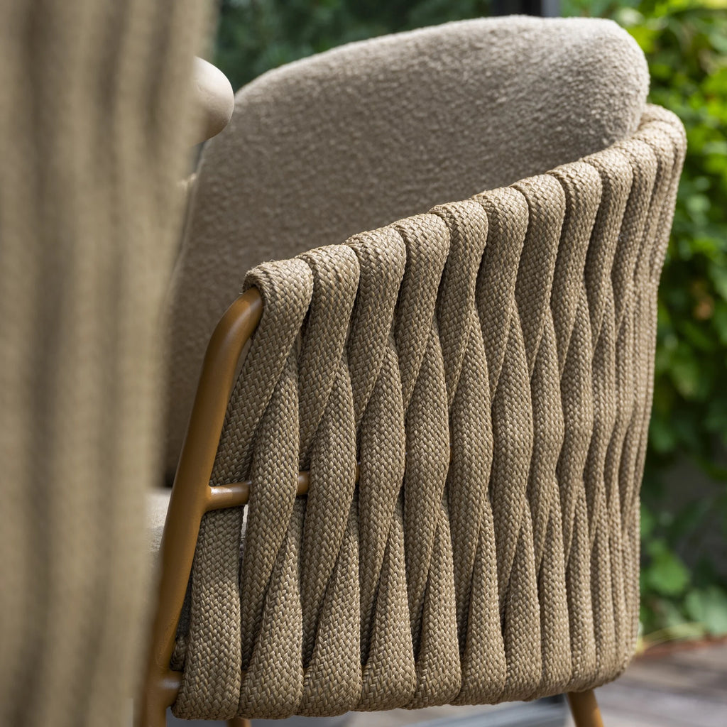 Elegant ontwerp: Amberkleurig aluminium frame gecombineerd met stijlvol rope-vlechtwerk, modern, warm en tijdloos.