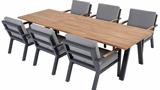 Tafel Ambassador 280x100, teak met aluminium onderstel in antraciet. Compleet met 6 comfortabele low dining stoelen. Showmodel!