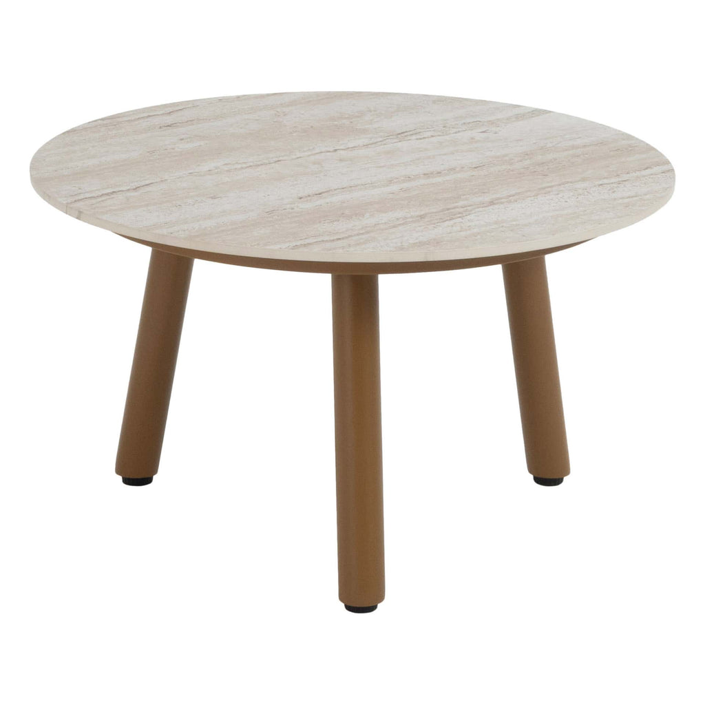Elegant ontwerp: Aluminium frame in de kleur Amber met een rond keramisch tafelblad, stijlvol, warm en tijdloos.