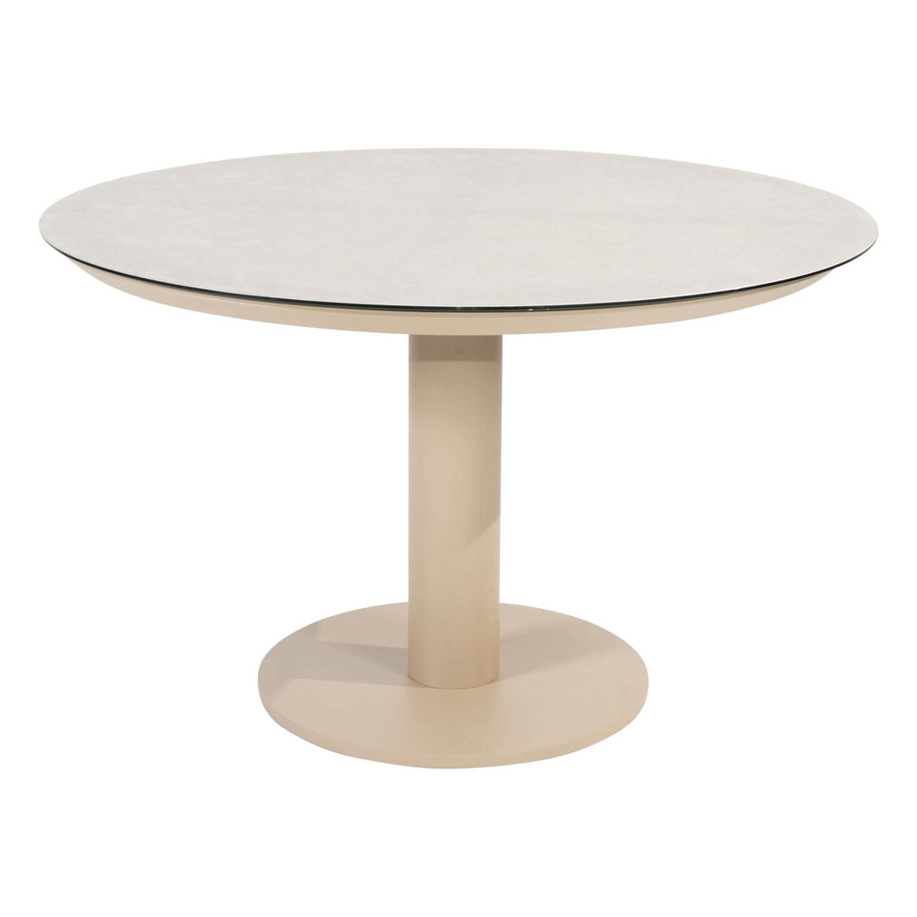 Elegant ontwerp: Aluminium frame in Latte gecombineerd met een rond tafelblad van printed keramiek.